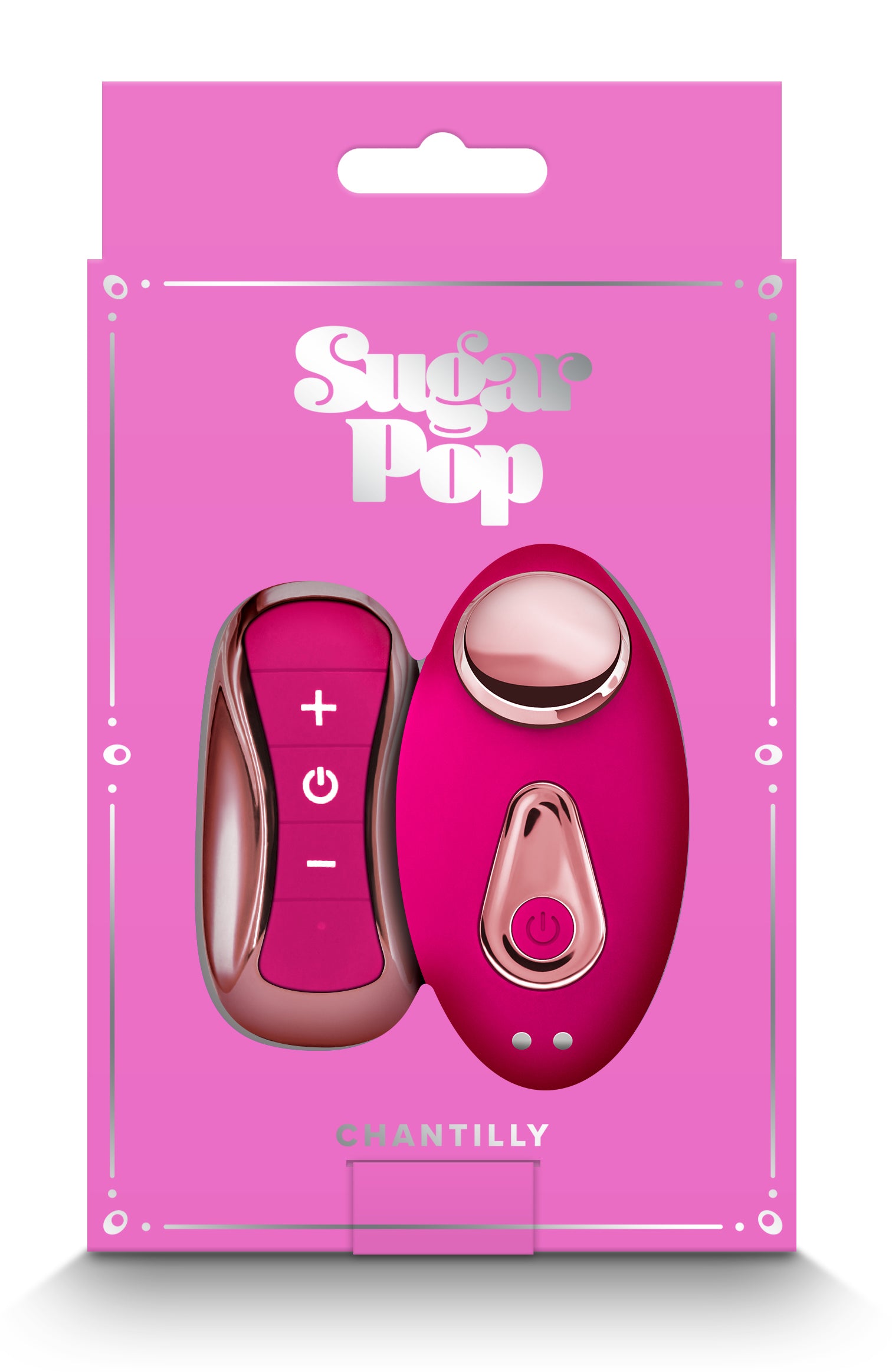 Chantilly by Sugar Pop is a remote-controlled panty vibe made of soft and flexible platinum grade silicone. Featuring a powerful magnet to secure the toy in the proper position, Chantilly delivers explosive stimulation via 10 vibration patterns. Chantilly is water resistant, rechargeable, and suitable with all lubricants / Remote is not. C2032 battery included.
